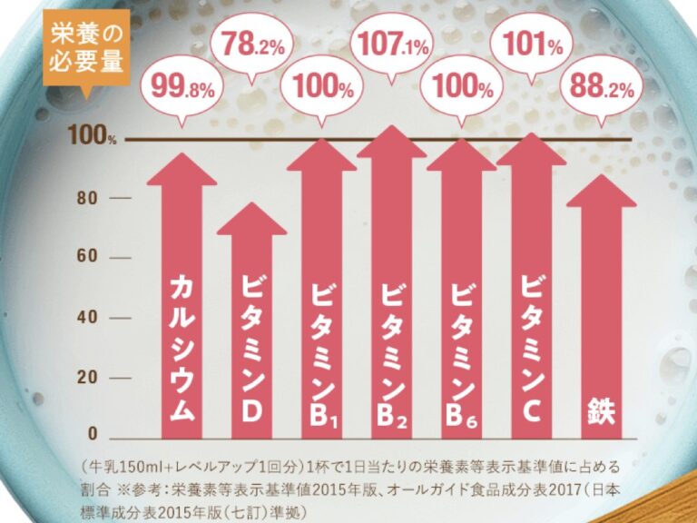 でも大丈夫!レベルアップを1杯飲むだけで、1日に必要なカルシウム99.8%も補えるから驚き!さらに、一緒にビタミンDを摂ることで、体内へのカルシウム吸収率が高まるそう※。