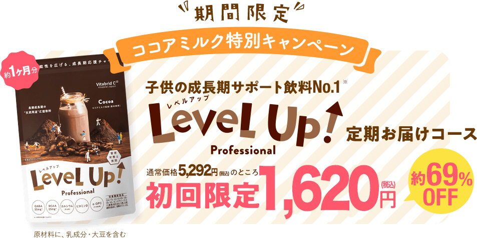 食事だけでは補いきれない栄養をレベルアップで補うのは、子ども想いの賢い選択言えるでしょう。現在、期間限定で定価5,292円(税込)が初回のみ1,620円(税込)で購入できるチャンスです。お子さまの可能性を伸ばすため、この機会に試してみてはいかがでしょうか?