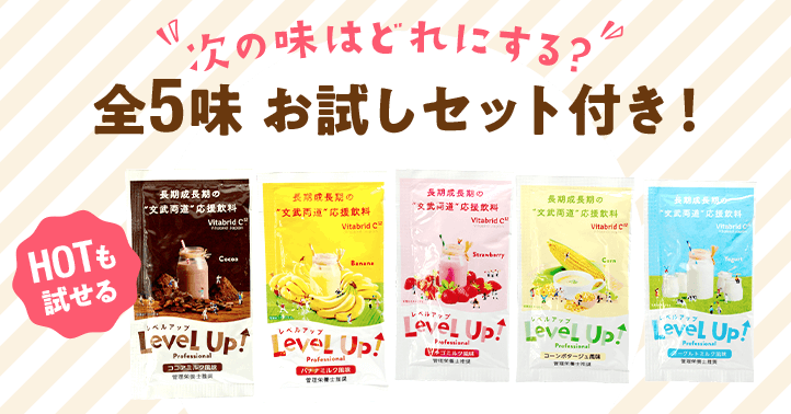 さらに今なら、特典として専用のシェイカーとスプーン、5種類の味を試せるサンプルセットもプレゼントだそうです。レベルアップで、お子様の可能性をぐーーーんと伸ばしてあげましょう。