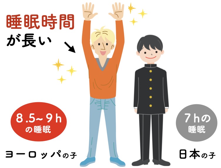 成長期に睡眠が大切なのは有名な話。日本に比べて、欧米は「子どもの睡眠時間が長い」のが特徴です。日本人と欧米人の成長期を比べてみると、中学生までは睡眠時間に差はありません。でも高校生になると、その差が大きく広がってしまいます!