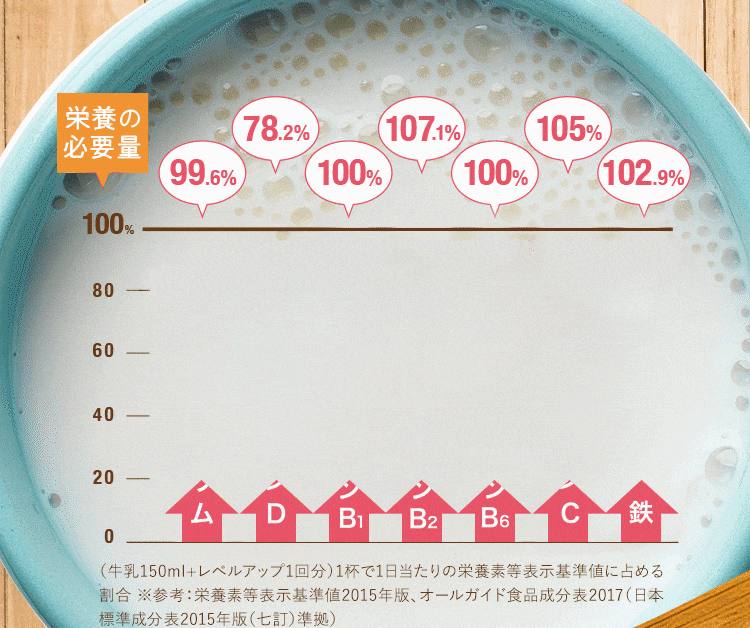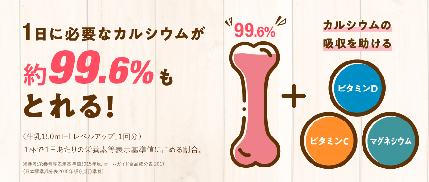 毎日どれだけ必要な栄養素をとれるかで【将来の健康】が決まります骨量の増加は10代がピーク※1で、カルシウム量は1日に牛乳750ml分(コップ約5杯)も必要となります。しかしレベルアップなら、成長期に必要なカルシウム量が1日1杯飲むだけで〈99.6%〉も補えます。