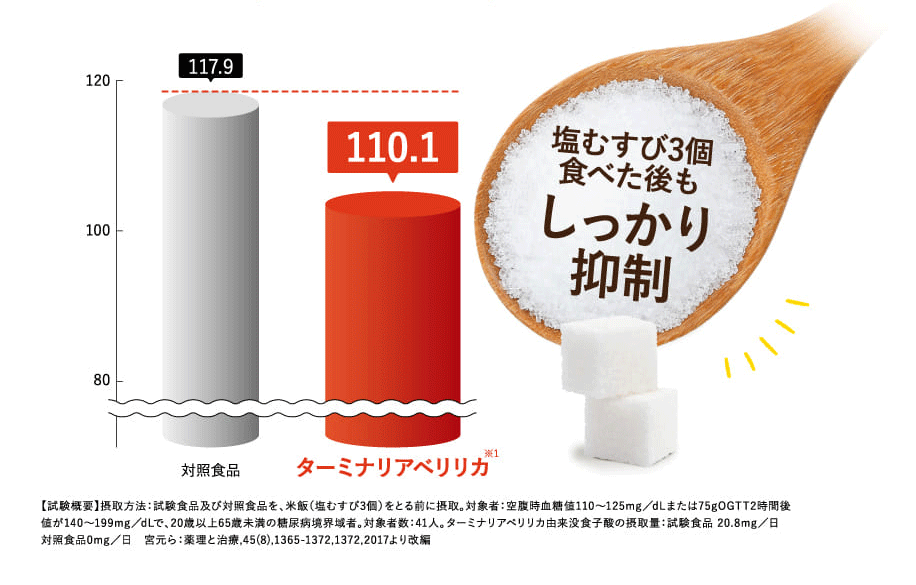 まずはこのグラフを見てください。ターミナリアべリリカを飲み、糖質の塊である「おにぎり」を3つも食べた後の血糖値の推移です。しっかり食後の血糖値が抑えられています!!!