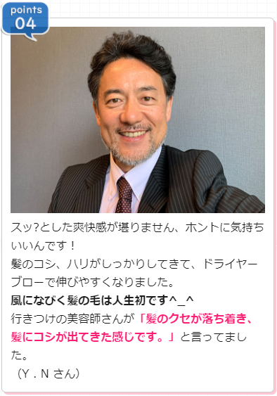 続けていけば、10年前、20年前のイキイキした髪を取り戻せるのではないかという期待もしています。
