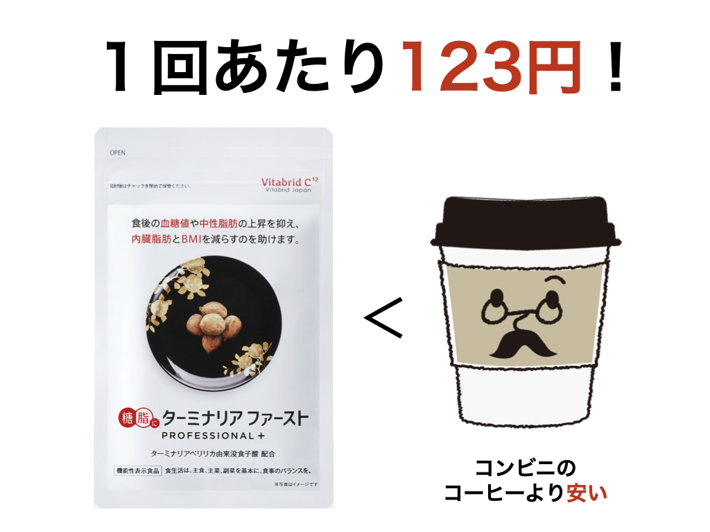 「糖脂にターミナリアファースト」はコスパが良いことも続けられる理由のひとつ。1日換算、たった123円。ペットボトル飲料より安いんです。一生モノのカラダが手に入る!こんなお得な投資は他にないと言っても過言ではありません。