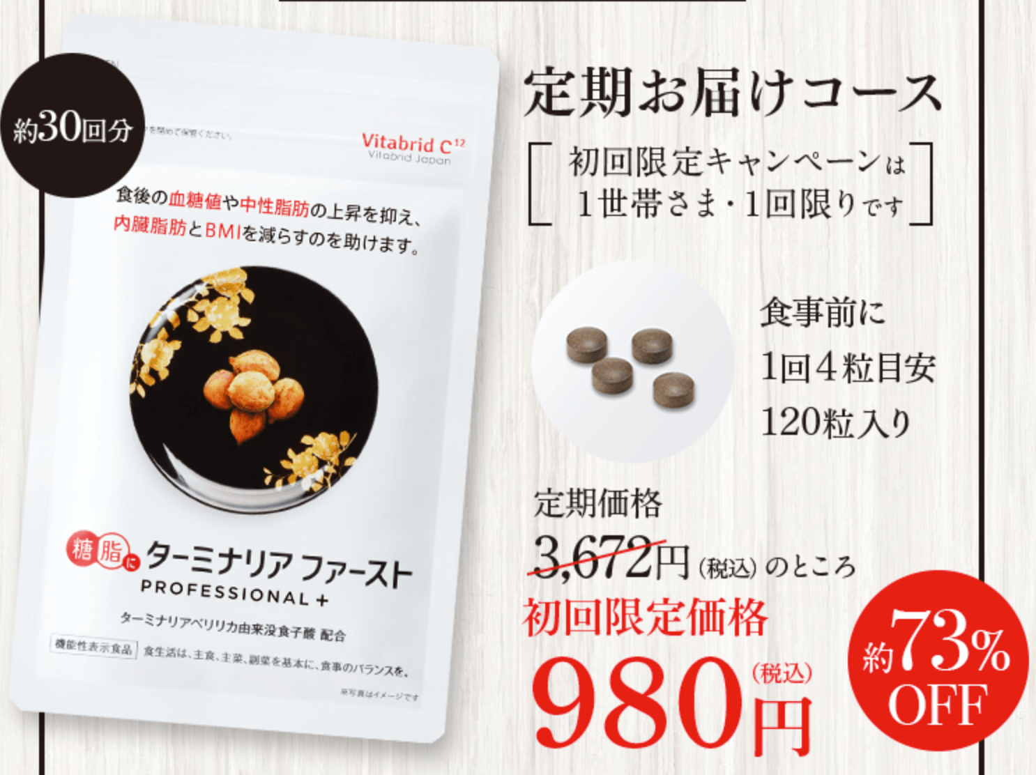 ■ターミナリアファースト プロフェッショナル+機能性表示食品(届出番号 F92) 届出表示:本品には、ターミナリアベリリカ由来没食子酸が含まれます。ターミナリアベリリカ由来没食子酸には、食事の糖や脂肪の吸収を抑え、食後の血糖値や中性脂肪の上昇を抑える機能、肥満気味な方の内臓脂肪とBMIを減らすのを助ける機能が報告されています。 ※本品は国の許可を受けたものではなく、消費長官に必要事項を届け出ることで、届出の責任の下、食品の容器包装に機能性表示をしております。 ※食生活の、主食、主菜、副菜をベースにした、食事バランスも重要です。 ※本品は、疾病の診断、治療、予防を目的としたものではありません。