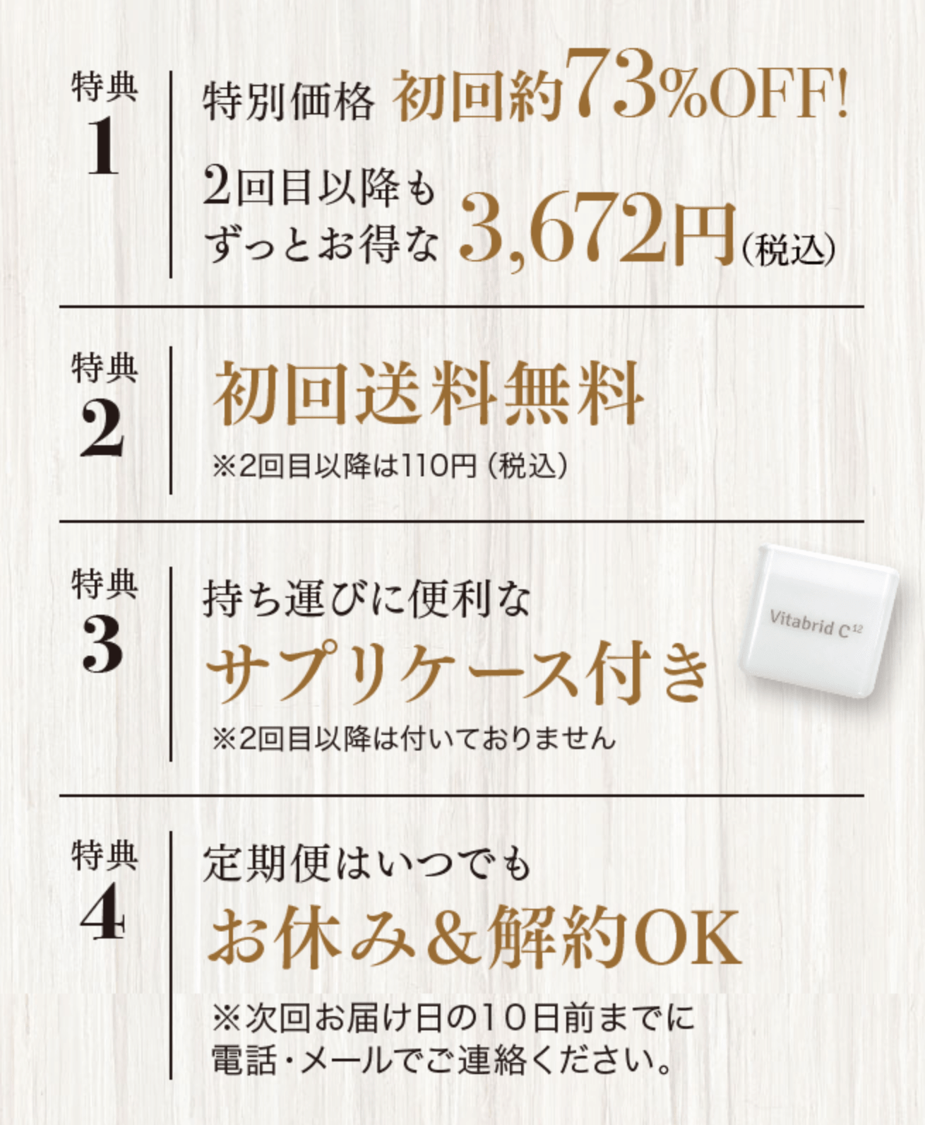 そして大事なこと。定期コースにしても、2回目以降いつでもお休み・解約を受けつけてくれます。もし続けるのが難しくなった場合も、これで安心!定期コースだと3ヶ月は続ける縛りがある会社も多いけど、ここは違います。